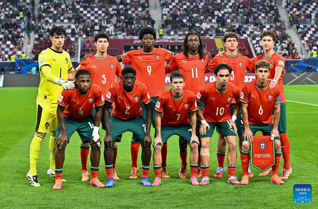 Starting players of Portugal pose for a group photo prior to the final match between Portugal and Austria at the FIFA U17 World Cup Qatar 2025 in Doha, Qatar, Nov. 27, 2025. Portugal won 1-0. (Photo by Nikku/Xinhua)