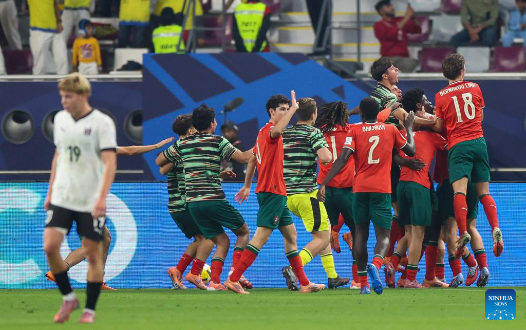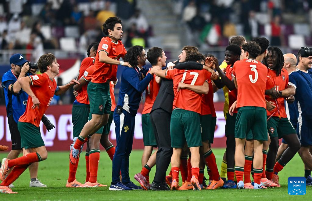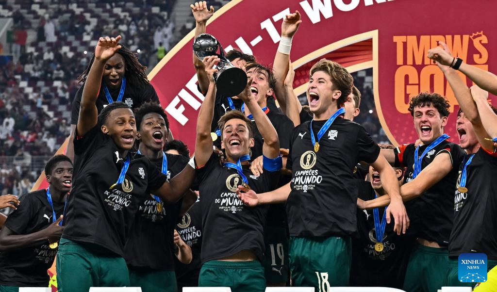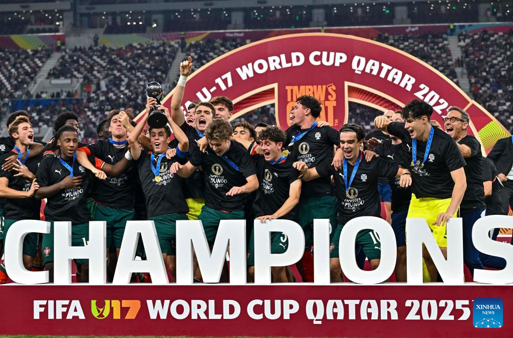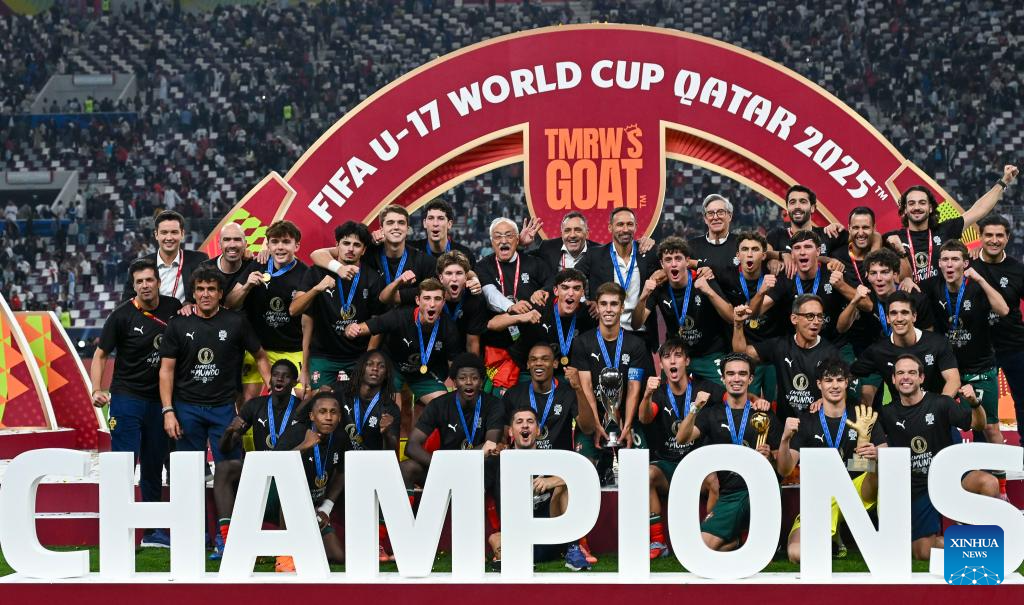 Players of Portugal celebrate after winning the final match between Portugal and Austria at the FIFA U17 World Cup Qatar 2025 in Doha, Qatar, Nov. 27, 2025. Portugal won 1-0. (Photo by Nikku/Xinhua)