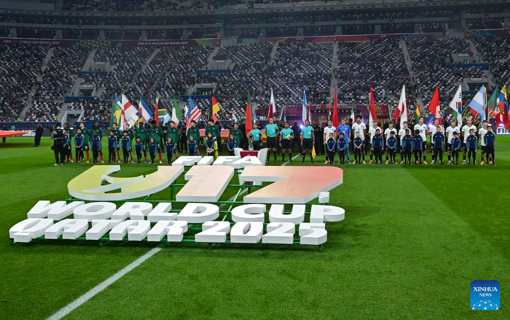 Players and referees line up prior to the final match between Portugal and Austria at the FIFA U17 World Cup Qatar 2025 in Doha, Qatar, Nov. 27, 2025. Portugal won 1-0. (Photo by Nikku/Xinhua)