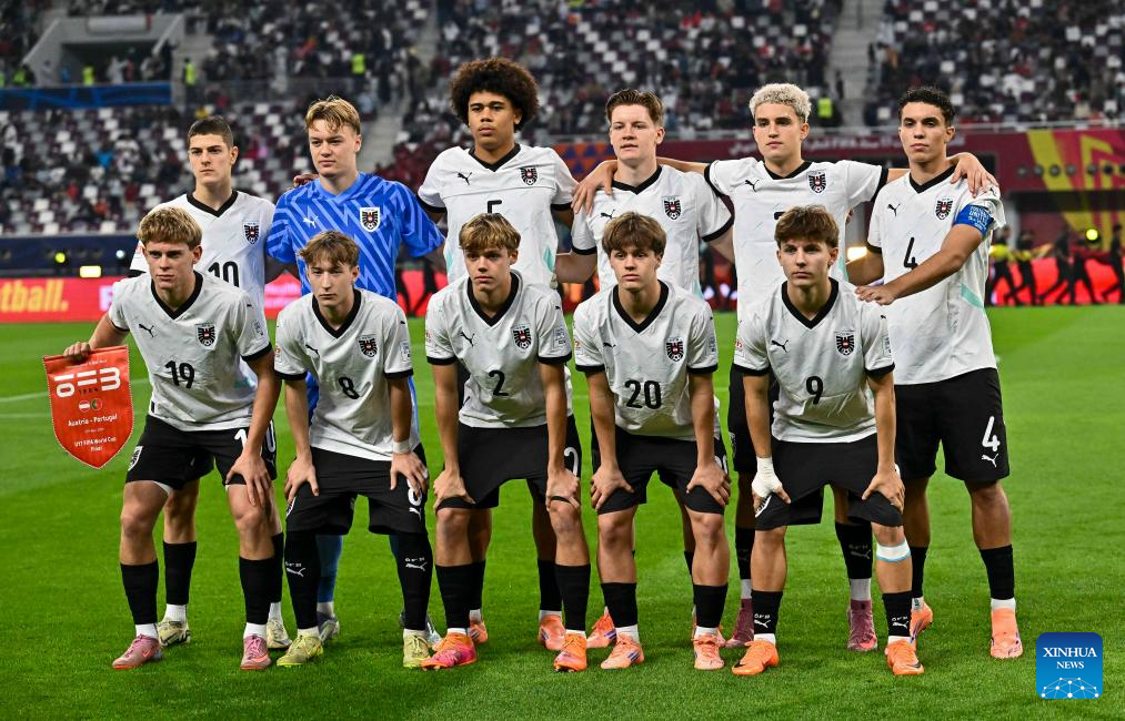 Starting players of Austria pose for a group photo prior to the final match between Portugal and Austria at the FIFA U17 World Cup Qatar 2025 in Doha, Qatar, Nov. 27, 2025. Portugal won 1-0. (Photo by Nikku/Xinhua)
