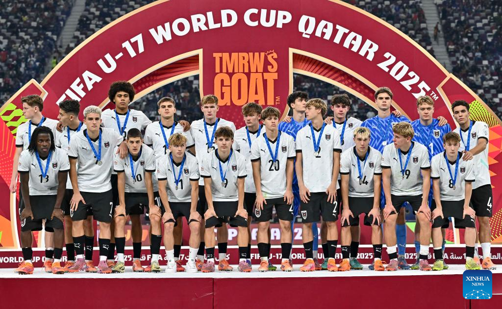 Second placed players of Austria pose on the podium after the final match between Portugal and Austria at the FIFA U17 World Cup Qatar 2025 in Doha, Qatar, Nov. 27, 2025. Portugal won 1-0. (Photo by Nikku/Xinhua)