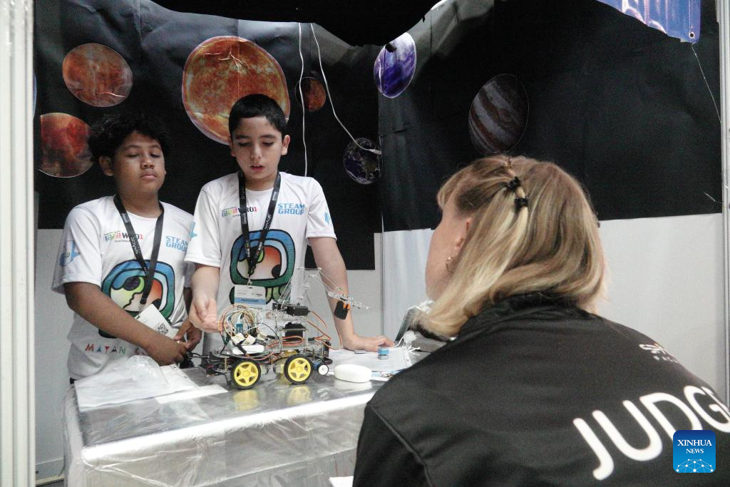 Competitors explain their project to a judge at the World Robot Olympiad (WRO) International Final 2025 in Singapore, Nov. 27, 2025. The three-day competition was held here from Wednesday to Friday. (Photo by Then Chih Wey/Xinhua)