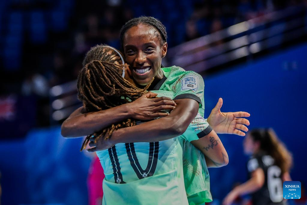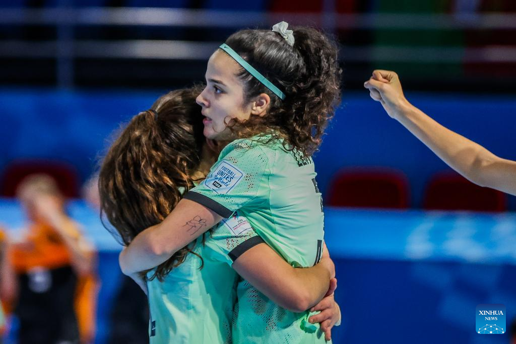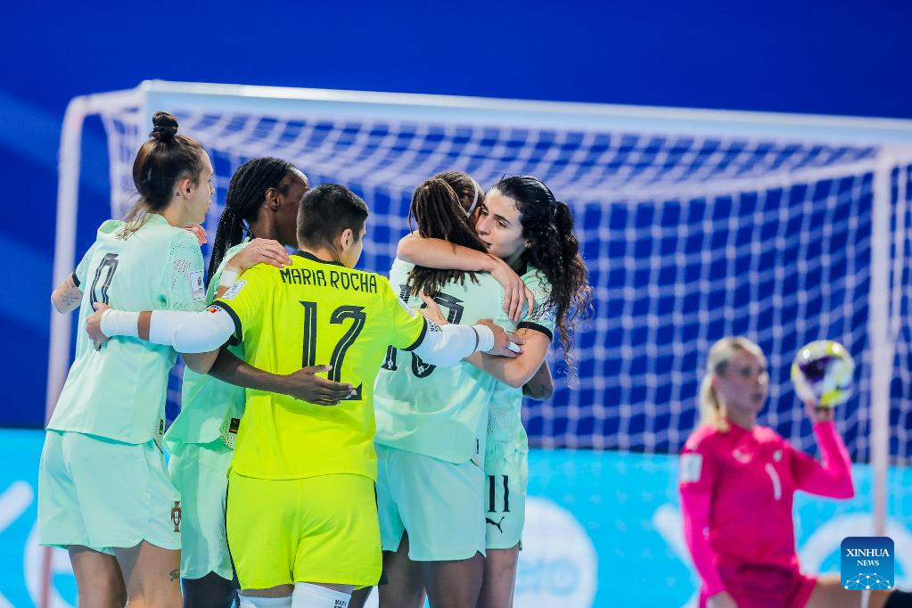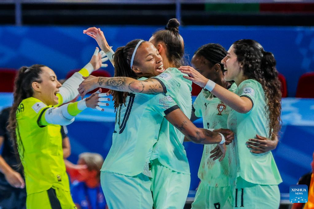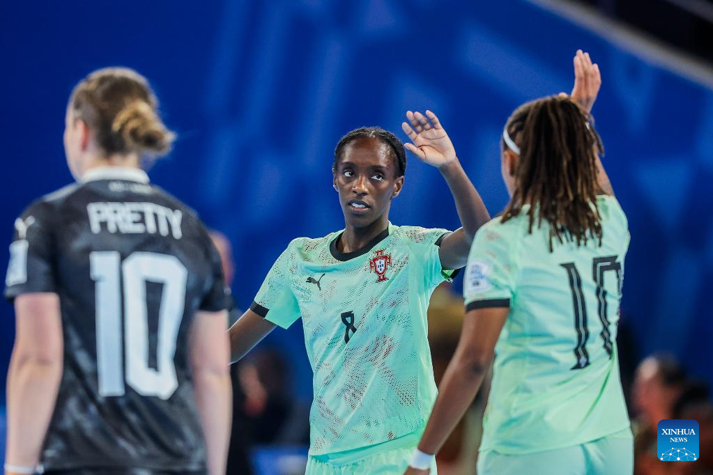 Players of Portugal celebrate after scoring a point during the group C match between Portugal and New Zealand at the FIFA Futsal Women's World Cup 2025 in Pasig City, the Philippines on Nov. 29, 2025. (Xinhua/Rouelle Umali)