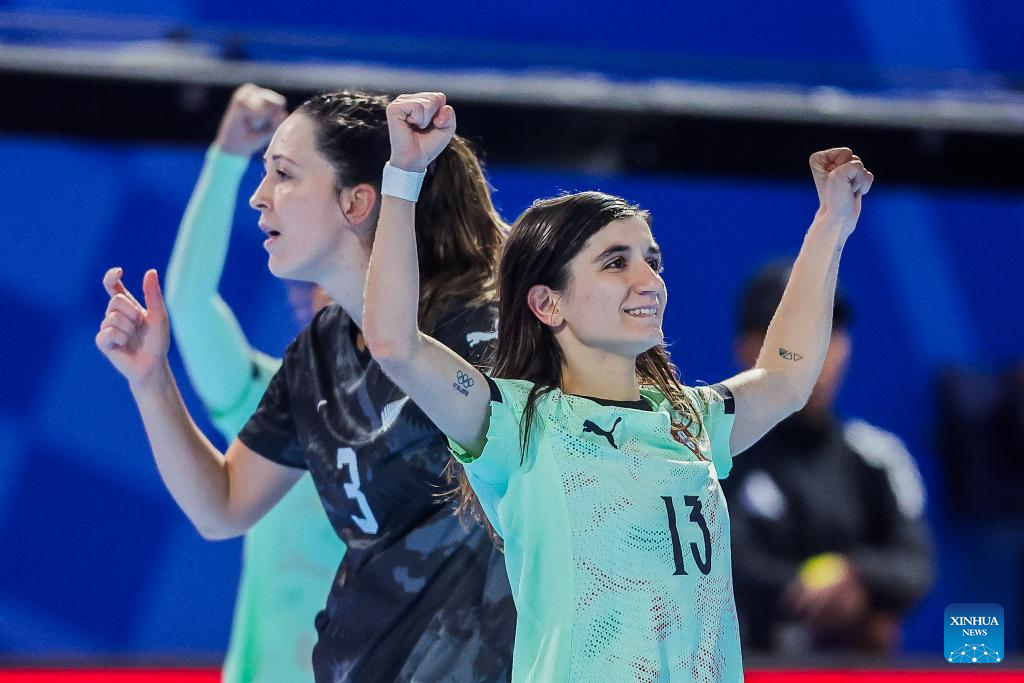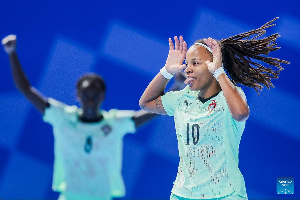 Maria Pereira (Front) of Portugal celebrates after scoring a point during the group C match between Portugal and New Zealand at the FIFA Futsal Women's World Cup 2025 in Pasig City, the Philippines on Nov. 29, 2025. (Xinhua/Rouelle Umali)