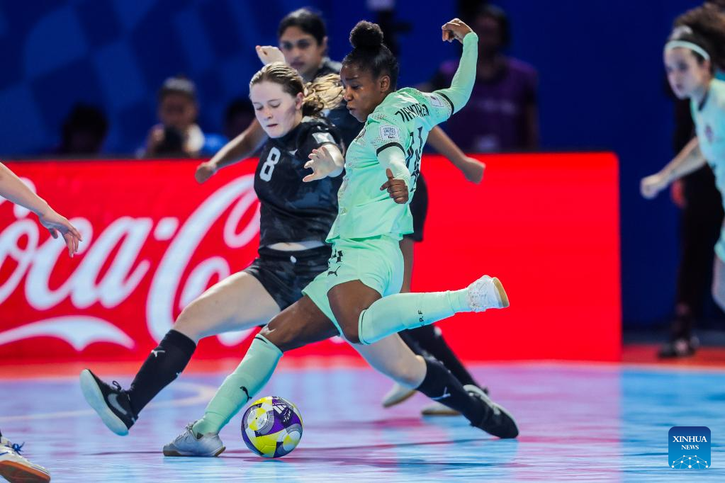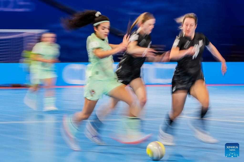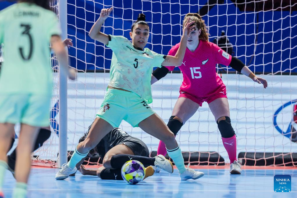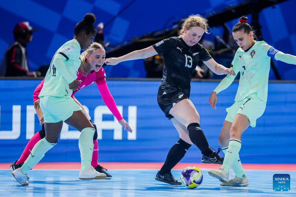 Ella James (2nd R) of New Zealand vies against players of Portugal during the group C match between Portugal and New Zealand at the FIFA Futsal Women's World Cup 2025 in Pasig City, the Philippines on Nov. 29, 2025. (Xinhua/Rouelle Umali)