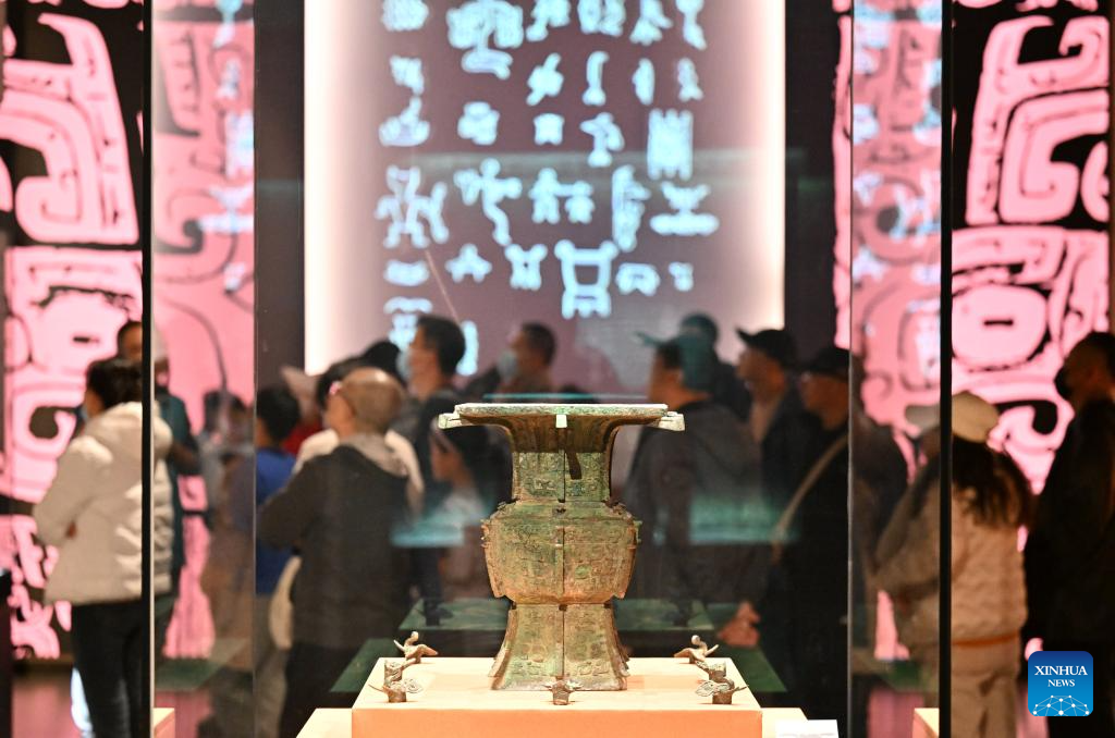 People view an exhibition on cultural relics from the Shang Dynasty (1600 BC-1046 BC) at the Tianjin Museum in Tianjin, north China, Nov. 29, 2025. The exhibition, featuring more than 180 pieces (sets) of cultural relics from the Shang Dynasty, has received more than 400,000 visitors since its opening on Aug. 23. (Xinhua/Li Ran)
