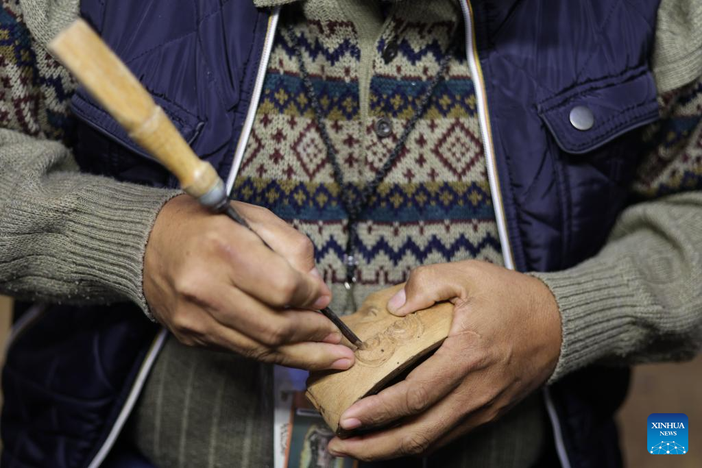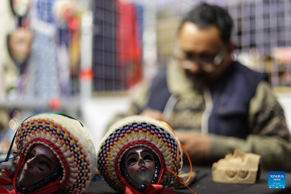 A Chinese artisan displays a handicraft at an original Mexican textile art fair in Mexico City, Mexico, Nov. 28, 2025. The fair brings together artisans from all across Mexico presenting textiles, jewelry, and other handcrafted items. International artisans from several countries, including China, were also invited. (Photo by Francisco Canedo/Xinhua)