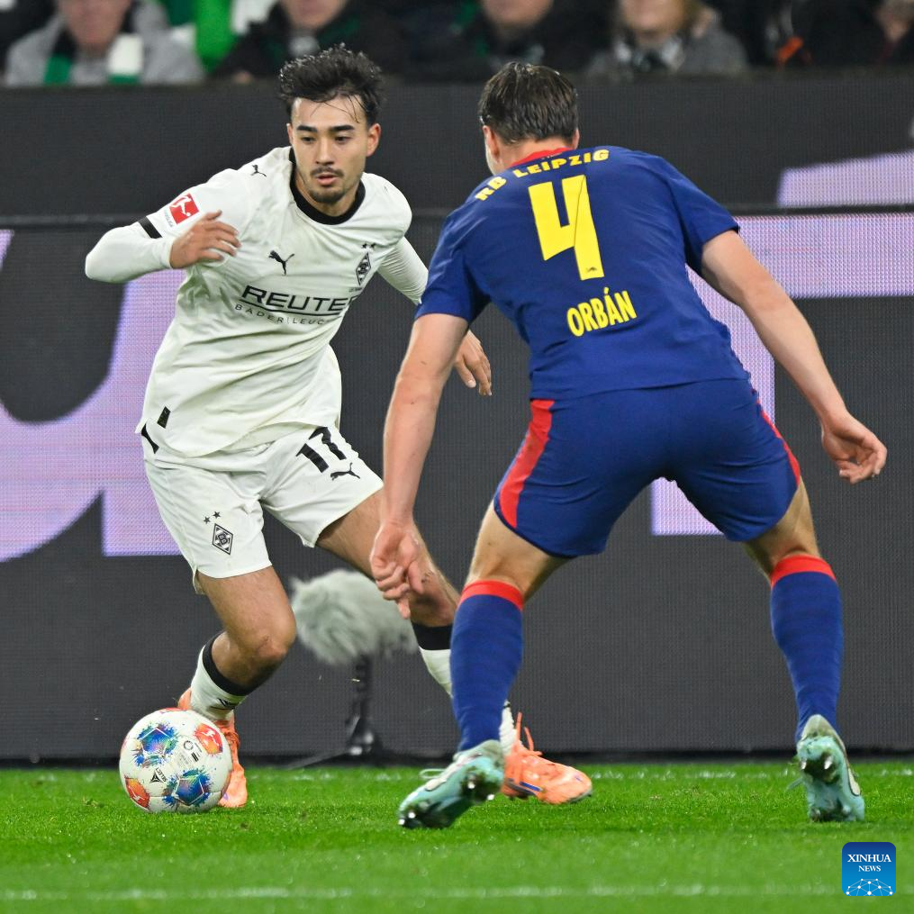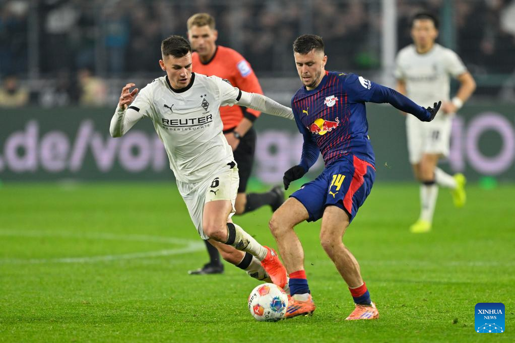 Johan Bakayoko (L) of RB Leipzig vies with Luca Netz of Borussia Moenchengladbach during the German first division of Bundesliga football match between Borussia Moenchengladbach and RB Leipzig in Moenchengladbach, Germany, Nov. 28, 2025. (Photo by Ulrich Hufnagel/Xinhua)
