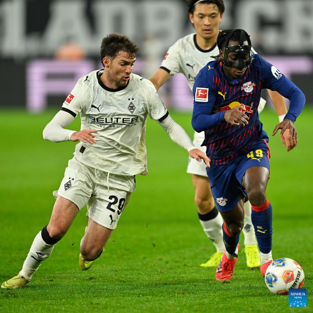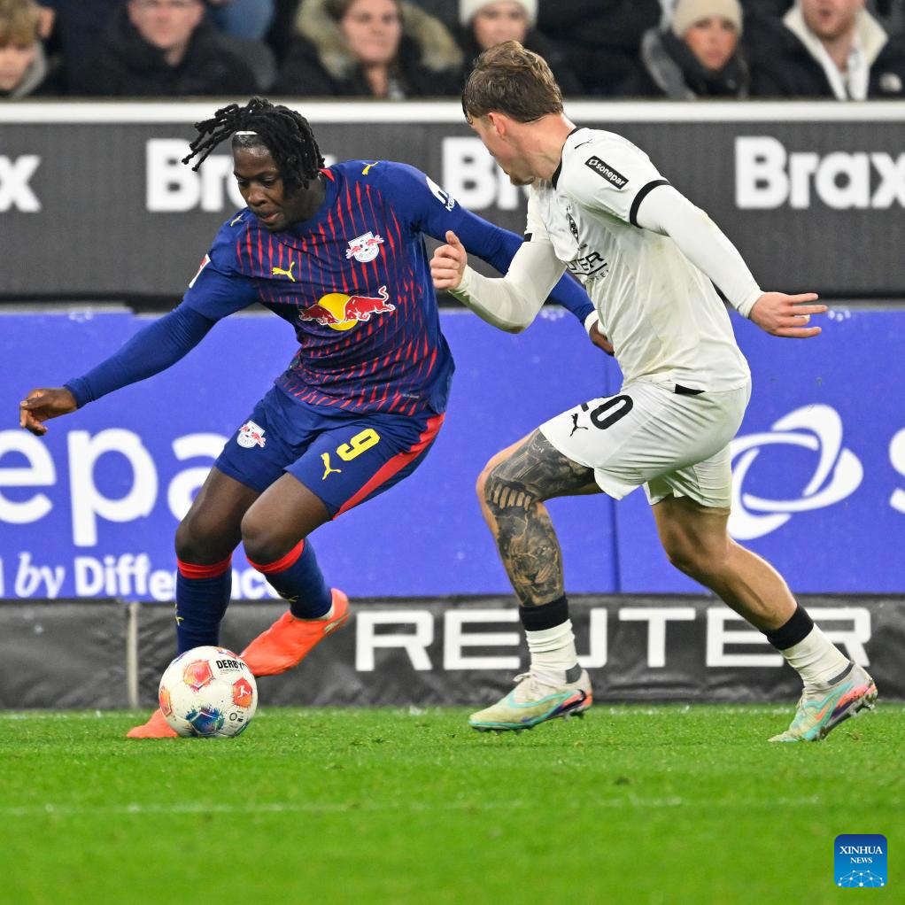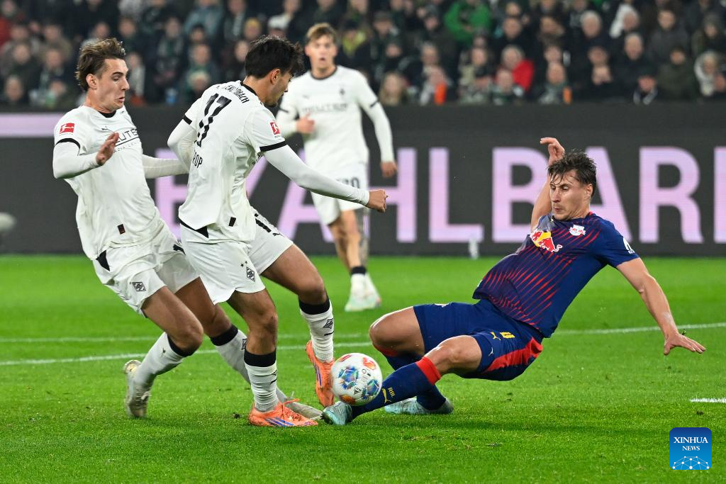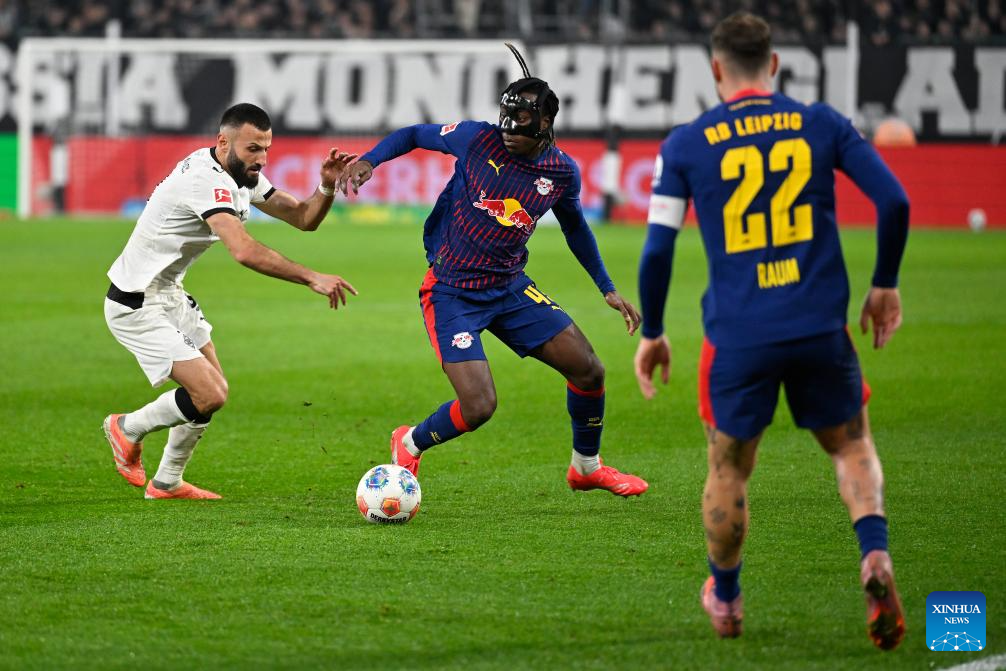 Yan Diomande (C) of RB Leipzig competes during the German first division of Bundesliga football match between Borussia Moenchengladbach and RB Leipzig in Moenchengladbach, Germany, Nov. 28, 2025. (Photo by Ulrich Hufnagel/Xinhua)