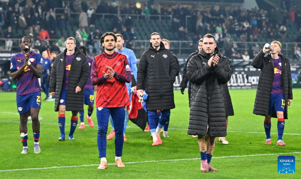 Players of RB Leipzig acknowledge spectators after the German first division of Bundesliga football match between Borussia Moenchengladbach and RB Leipzig in Moenchengladbach, Germany, Nov. 28, 2025. (Photo by Ulrich Hufnagel/Xinhua)