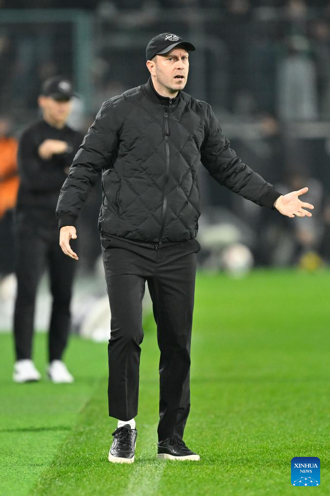 Eugen Polanski, head coach of Borussia Moenchengladbach, reacts during the German first division of Bundesliga football match between Borussia Moenchengladbach and RB Leipzig in Moenchengladbach, Germany, Nov. 28, 2025. (Photo by Ulrich Hufnagel/Xinhua)