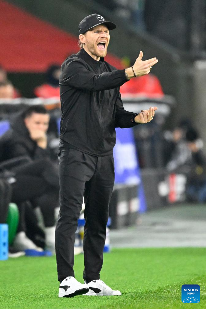Ole Werner, head coach of RB Leipzig, reacts during the German first division of Bundesliga football match between Borussia Moenchengladbach and RB Leipzig in Moenchengladbach, Germany, Nov. 28, 2025. (Photo by Ulrich Hufnagel/Xinhua)