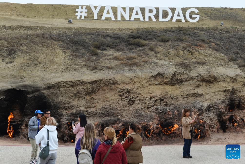 Tourists visit Yanardag on the Absheron Peninsula in Azerbaijan, Nov. 28, 2025. Known as "the burning mountain," Yanardag is a national natural heritage site of Azerbaijan. The everlasting flames here originate from natural gas that leaks through rock fissures. (Xinhua/Chen Junfeng)