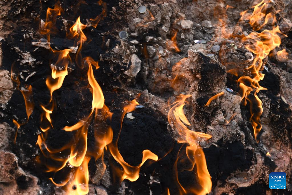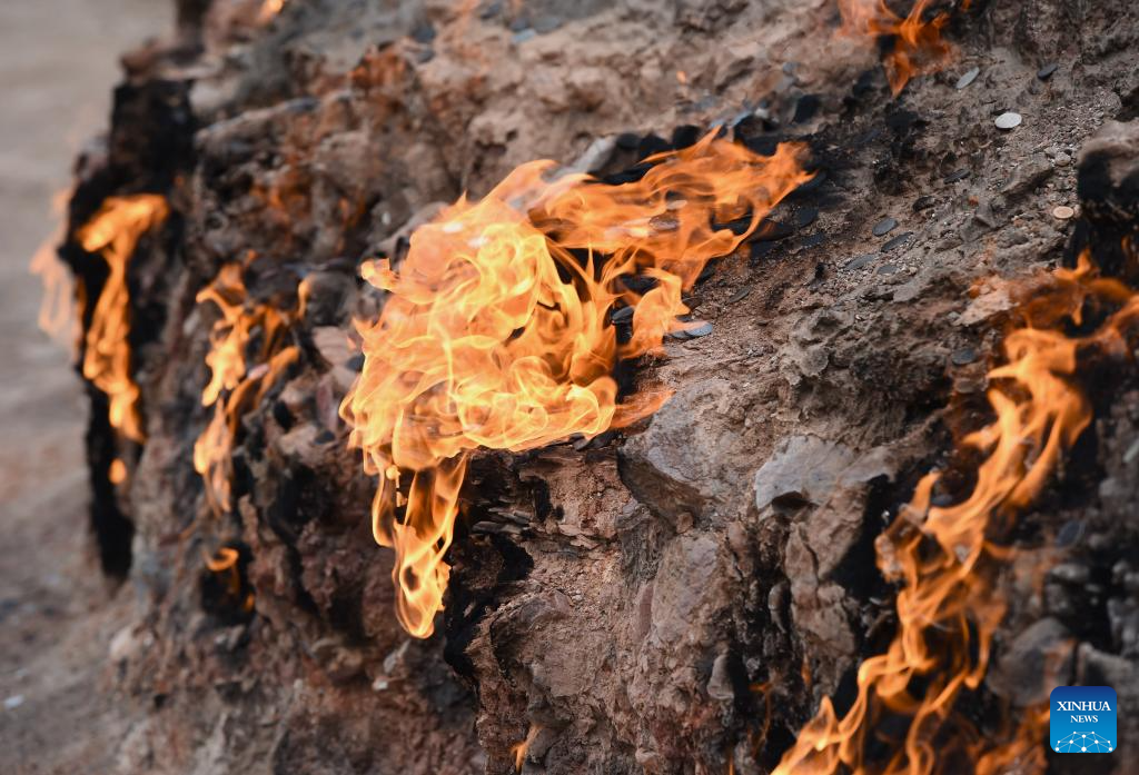 Flames blaze in rock fissures at Yanardag on the Absheron Peninsula in Azerbaijan, Nov. 28, 2025. Known as "the burning mountain," Yanardag is a national natural heritage site of Azerbaijan. The everlasting flames here originate from natural gas that leaks through rock fissures. (Xinhua/Chen Junfeng)