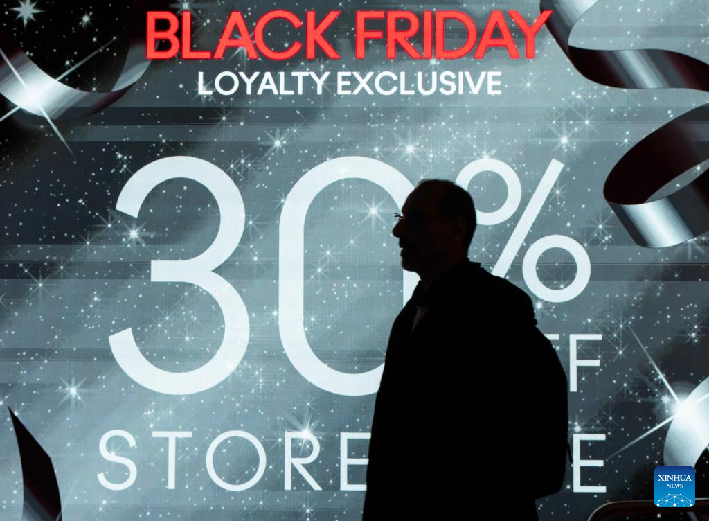 A man walks past a promotion sign of a shop during Black Friday sales event in Toronto, Canada, Nov. 28, 2025. (Photo by Zou Zheng/Xinhua)
