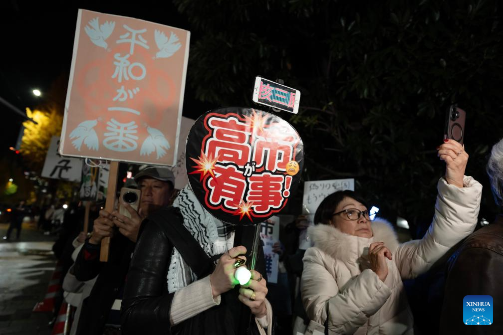 People attend a protest in front of the Japanese prime minister's official residence in Tokyo, Japan, Nov. 28, 2025. In response to Japanese Prime Minister Sanae Takaichi's recent erroneous remarks on China's Taiwan and her continued lack of remorse, Japanese people held another large-scale protest in Tokyo on Friday evening, demanding that Takaichi retract her statements. (Xinhua/Jia Haocheng)