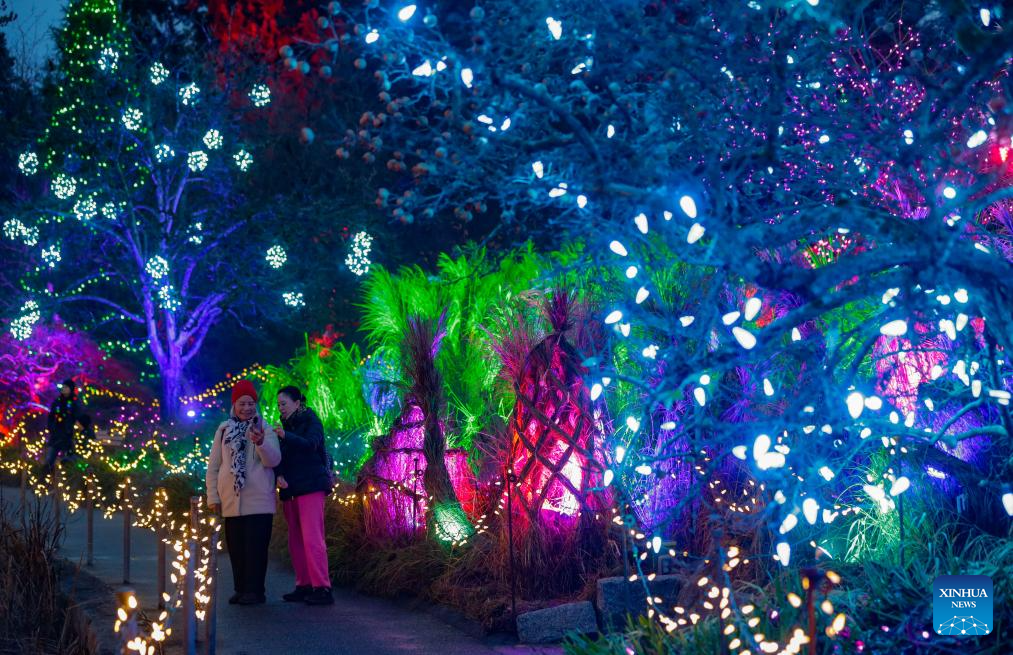 People enjoy the light installations at VanDusen Botanical Garden during the annual Festival of Lights in Vancouver, British Columbia, Canada, Nov. 28, 2025. The annual holiday event kicked off here on Friday, with over 1 million lights transforming the garden into a dazzling holiday spectacle. (Photo by Liang Sen/Xinhua)