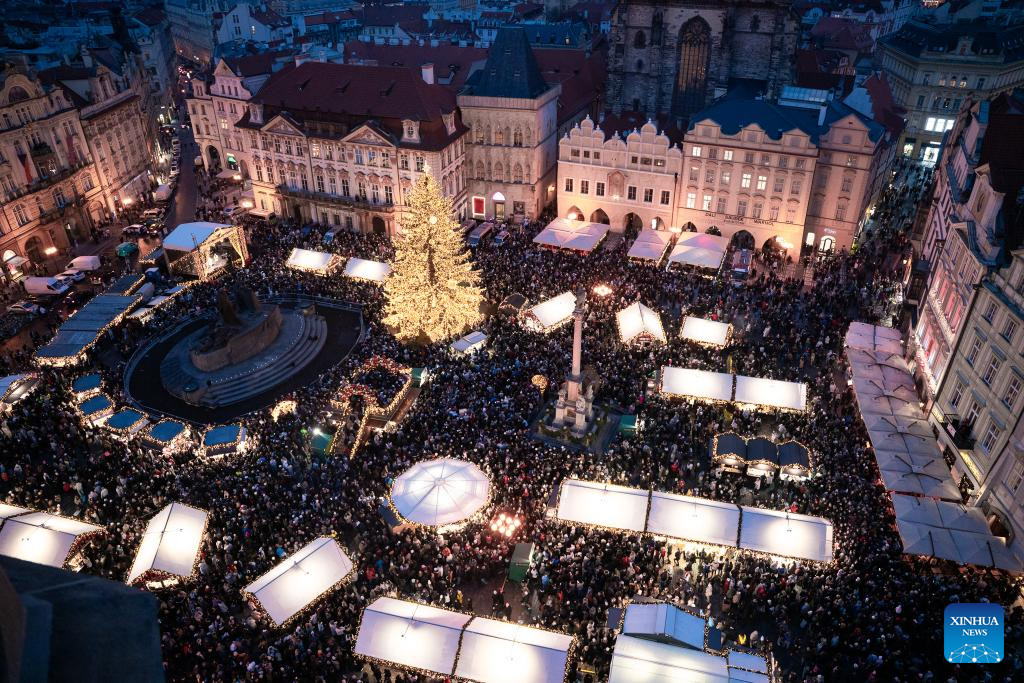 People visit a Christmas market in Prague, the Czech Republic, Nov. 29, 2025. The Christmas market in Prague's Old Town officially opened on Saturday, attracting large numbers of residents and tourists. (Photo by Dana Kesnerova/Xinhua)
