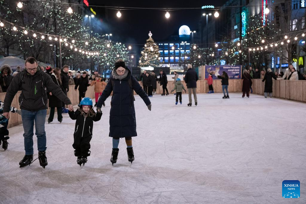 People skate at a Christmas market in Prague, the Czech Republic, Nov. 29, 2025. The Christmas market in Prague's Old Town officially opened on Saturday, attracting large numbers of residents and tourists. (Photo by Dana Kesnerova/Xinhua)