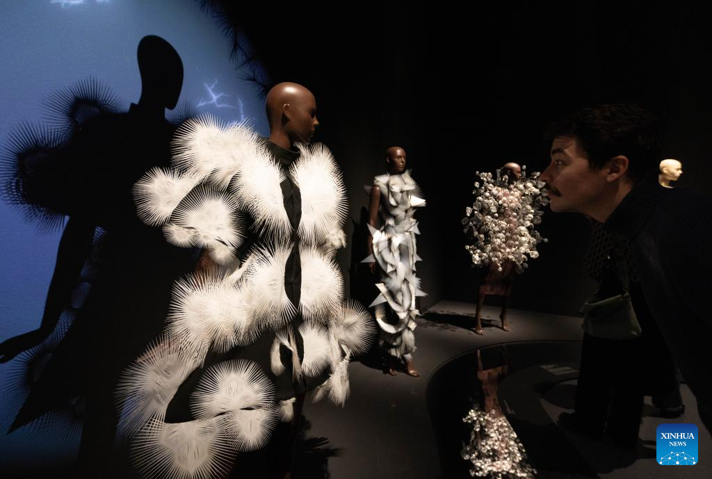 An exhibition themed "Sculpting the Senses" is held in Rotterdam, the Netherlands, Nov. 29, 2025. The exhibition shows the works of Dutch fashion designer Iris van Herpen. (Photo by Sylvia Lederer/Xinhua)