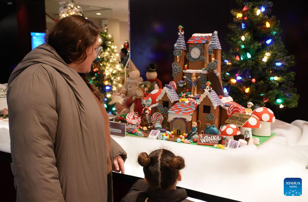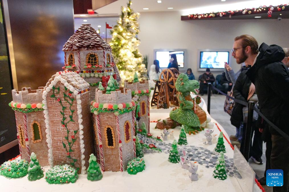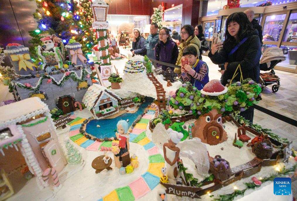 People look at a gingerbread house creation during the annual "Gingerbread Lane" event in Vancouver, British Columbia, Canada, Nov. 29, 2025. Canada's longest-running gingerbread house display event returned for its 33rd year, featuring more than 30 gingerbread houses and inviting the public to vote for their favourite creations crafted by professional bakers, culinary artists, and culinary school students. (Photo by Liang Sen/Xinhua)