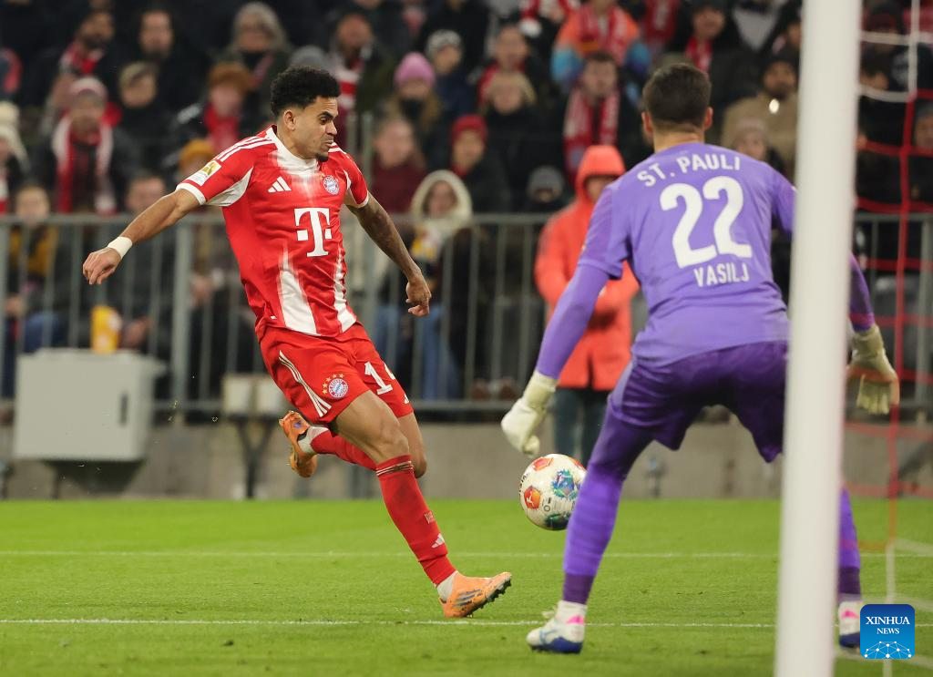 BERLIN, Nov. 29 (Xinhua) -- Two stoppage-time goals from Luis Diaz and Nicolas Jackson fueled Bayern Munich to a 3-1 home win over St. Pauli to maintain its lead at the top of the Bundesliga on Saturday.