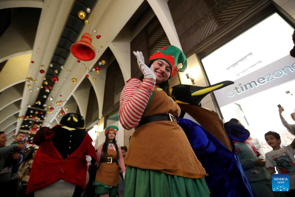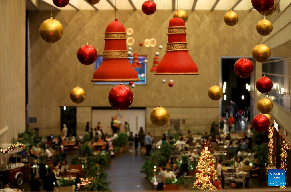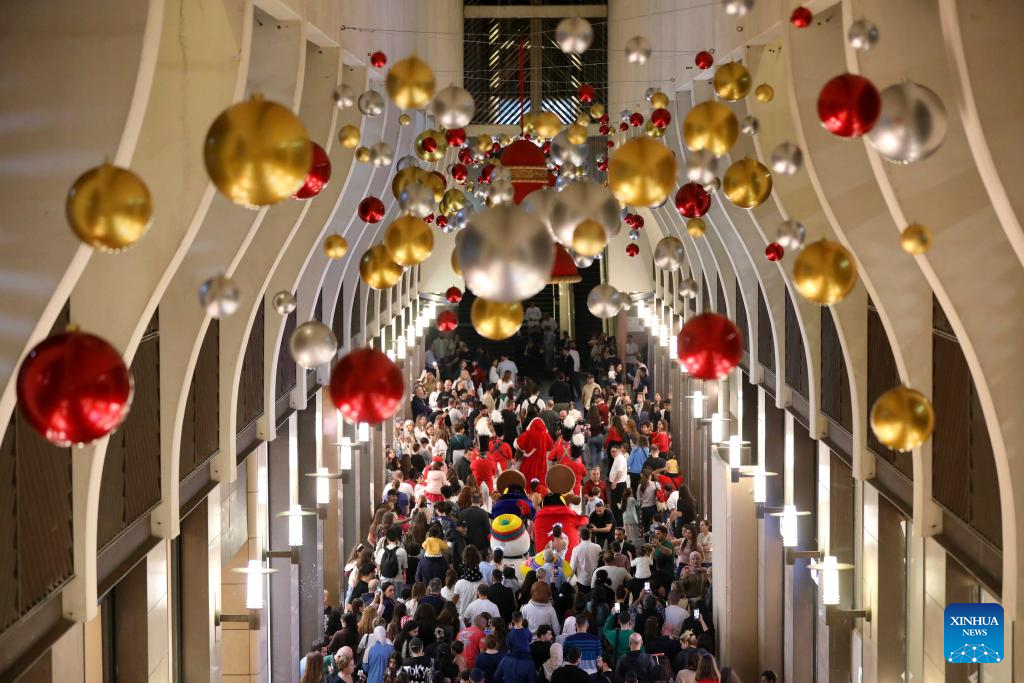 People enjoy the Christmas atmosphere at the Beirut Souks in Beirut, Lebanon, Nov. 29, 2025. The Christmas season kicked off with the lighting of a Christmas tree and the unveiling of festive decorations at the Beirut Souks on Saturday night. (Xinhua/Bilal Jawich)