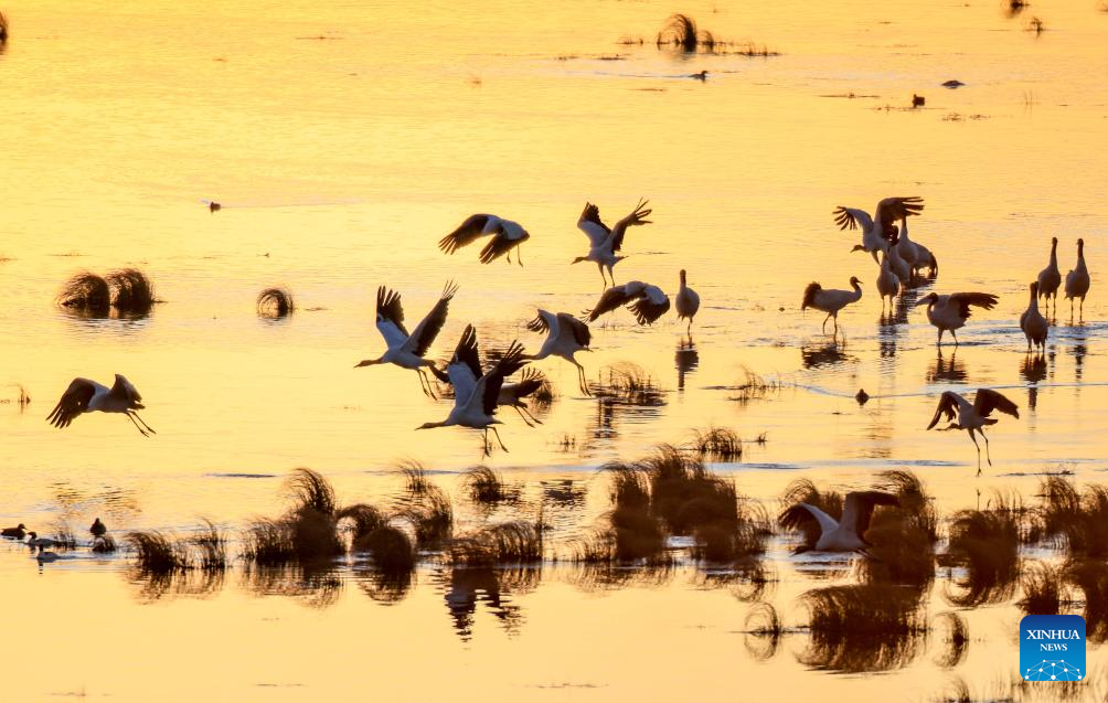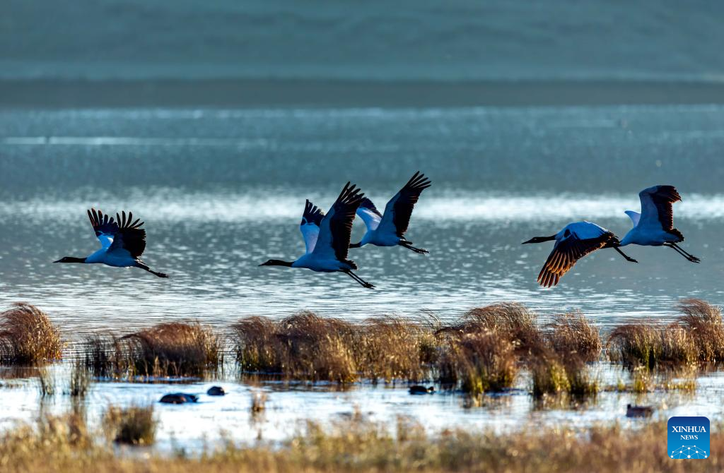 Black-necked cranes fly over a wetland of the Yunnan Dashanbao National Nature Reserve for Black-necked Cranes in Zhaotong City, southwest China's Yunnan Province, on Nov. 30, 2025. Yunnan Dashanbao National Nature Reserve for Black-necked Cranes is a significant wintering habitat and transfer station for migratory black-necked cranes on the Yunnan-Guizhou Plateau. At present, more than a thousand black-necked cranes have flown to the nature reserve to winter here. (Photo by Wang Changyu/Xinhua)