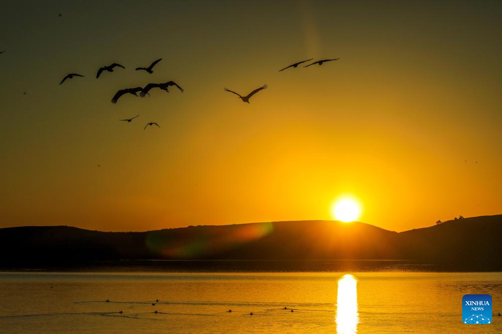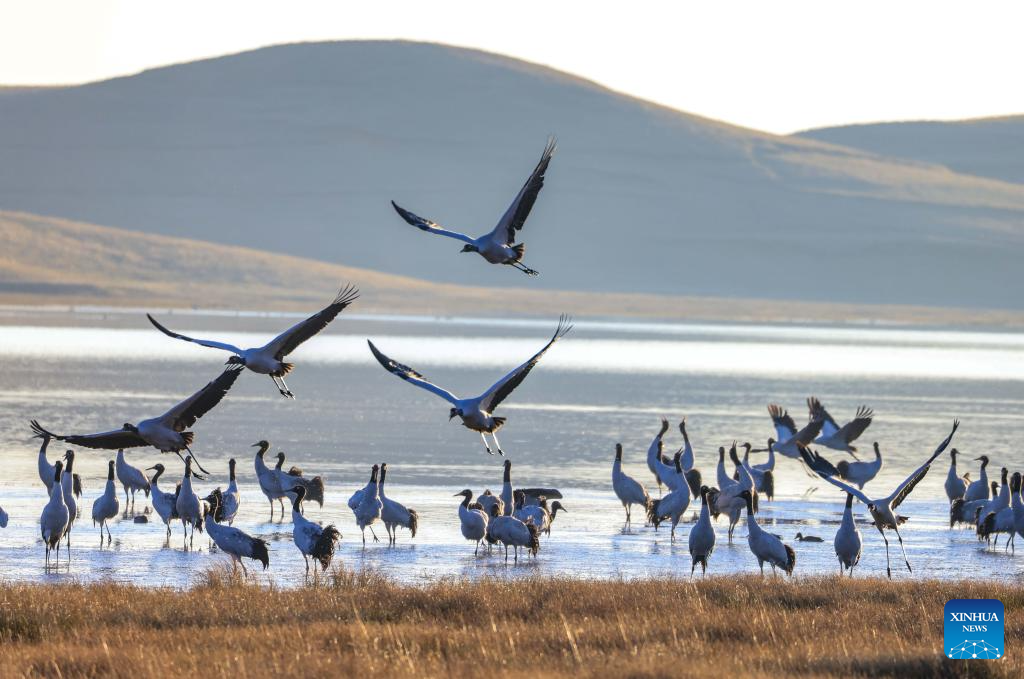 Black-necked cranes fly over a wetland of the Yunnan Dashanbao National Nature Reserve for Black-necked Cranes in Zhaotong City, southwest China's Yunnan Province, on Nov. 29, 2025. Yunnan Dashanbao National Nature Reserve for Black-necked Cranes is a significant wintering habitat and transfer station for migratory black-necked cranes on the Yunnan-Guizhou Plateau. At present, more than a thousand black-necked cranes have flown to the nature reserve to winter here. (Photo by Chen Xi/Xinhua)
