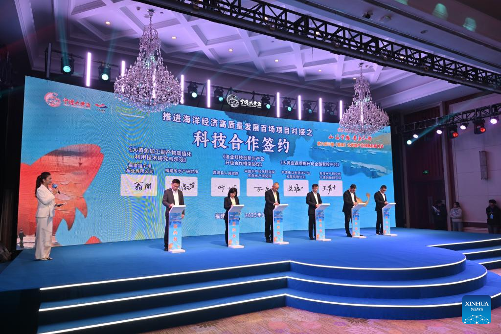 Guests attend a signing ceremony at the ninth Ningde (Xiapu) large yellow croaker industry innovation and development conference in Xiapu County, southeast China's Fujian Province, Nov. 29, 2025.