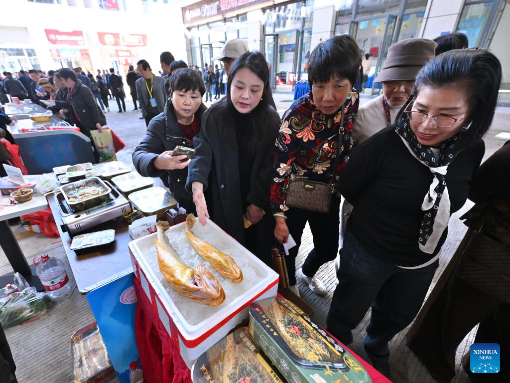 People shop for large yellow croaker products at the ninth Ningde (Xiapu) large yellow croaker industry innovation and development conference in Xiapu County, southeast China's Fujian Province, Nov. 29, 2025.