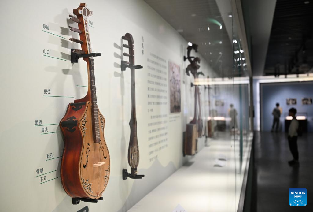 A visitor (R) learns to play a horse-head fiddle during an exhibition themed on various music cultures along the ancient Silk Road at Guangzhou Maritime Museum in Guangzhou, south China's Guangdong Province, Nov. 29, 2025. The exhibition kicked off here on Saturday, showcasing 143 ancient musical instruments from countries along the Silk Road. The exhibition, which will run until April 6, 2026, presents the historical context and artistic integration of musical instruments in the cultural exchanges between the East and the West. (Xinhua/Deng Hua)