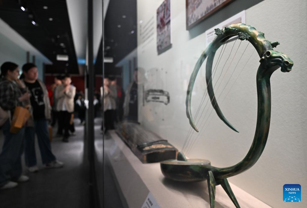 Musical instruments are on display during an exhibition themed on various music cultures along the ancient Silk Road at Guangzhou Maritime Museum in Guangzhou, south China's Guangdong Province, Nov. 29, 2025. The exhibition kicked off here on Saturday, showcasing 143 ancient musical instruments from countries along the Silk Road. The exhibition, which will run until April 6, 2026, presents the historical context and artistic integration of musical instruments in the cultural exchanges between the East and the West. (Xinhua/Deng Hua)