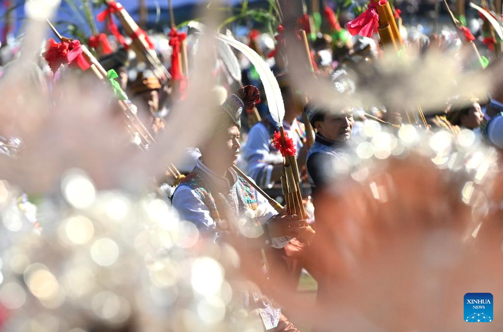 People perform with Lusheng, a traditional reed-pipe wind instrument, to celebrate Lusheng and horse fighting festival in Rongshui Miao Autonomous County, south China's Guangxi Zhuang Autonomous Region, Nov. 29, 2025. Rongshui County has leveraged its unique cultural resources of Lusheng to strengthen the inheritance of Miao ethnic culture and empower rural revitalization. (Xinhua/Huang Xiaobang)