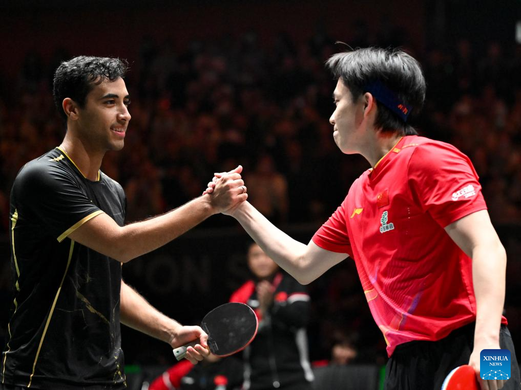 Wang Chuqin (R) of China shakes hands with Youssef Abdelaziz of Egypt after their men's singles match during the stage 1 group match between China and Egypt at the ITTF Mixed Team World Cup 2025 in Chengdu, southwest China's Sichuan Province, Dec. 1, 2025. (Xinhua/Xu Bingjie)