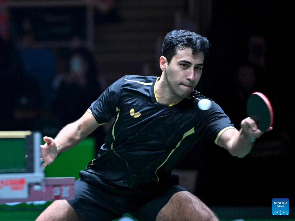 Youssef Abdelaziz of Egypt competes in the men's singles match against Wang Chuqin of China during the stage 1 group match between China and Egypt at the ITTF Mixed Team World Cup 2025 in Chengdu, southwest China's Sichuan Province, Dec. 1, 2025. (Xinhua/Xu Bingjie)