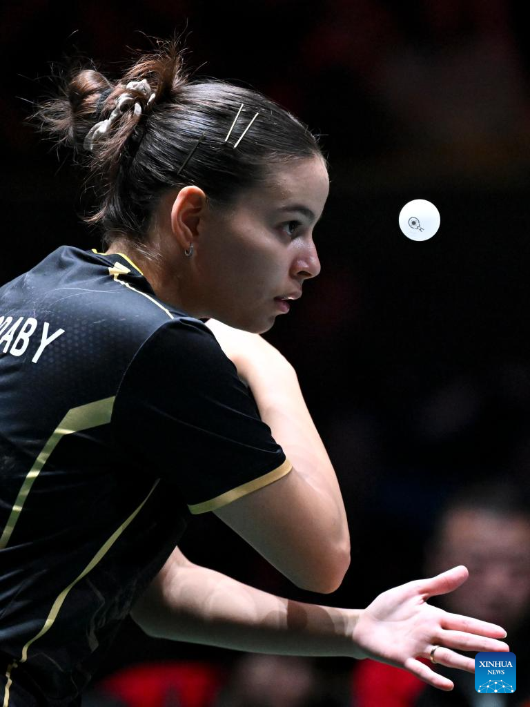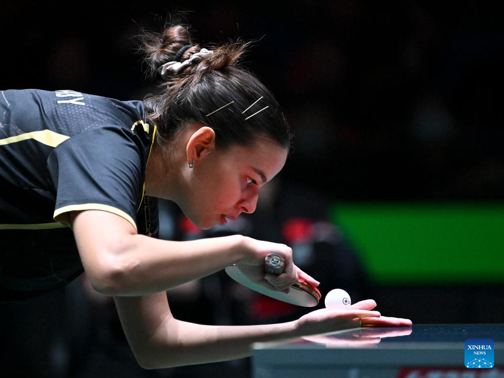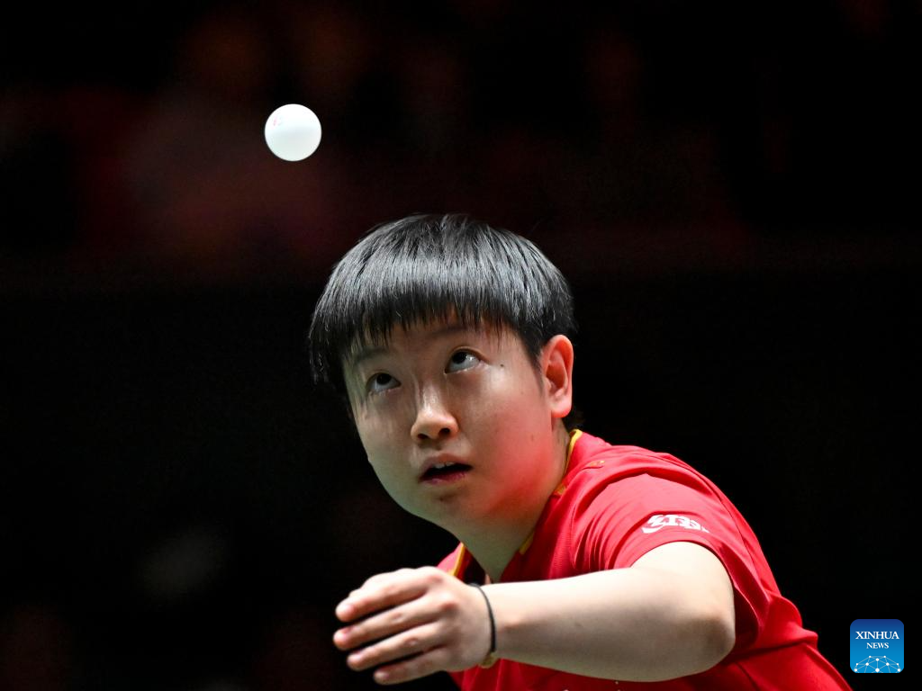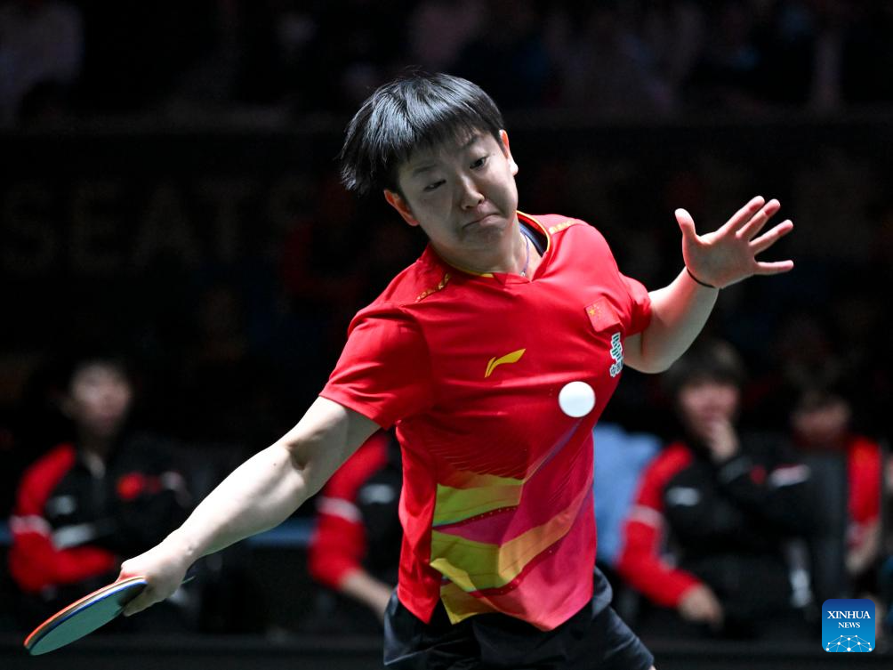 Sun Yingsha of China competes in the women's singles match against Mariam Alhodaby of Egypt during the stage 1 group match between China and Egypt at the ITTF Mixed Team World Cup 2025 in Chengdu, southwest China's Sichuan Province, Dec. 1, 2025. (Xinhua/Xu Bingjie)