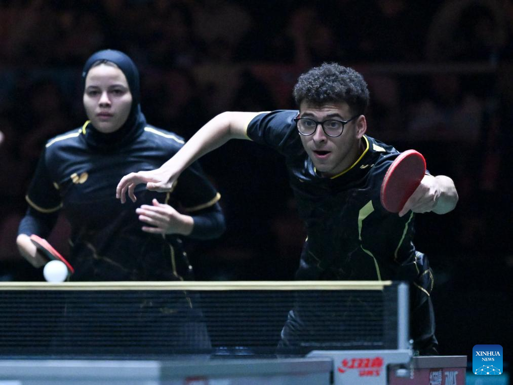 Badr Mostafa (R)/Marwa Alhodaby of Egypt compete in the mixed doubles match against Lin Shidong/Kuai Man of China during the stage 1 group match between China and Egypt at the ITTF Mixed Team World Cup 2025 in Chengdu, southwest China's Sichuan Province, Dec. 1, 2025. (Xinhua/Xu Bingjie)