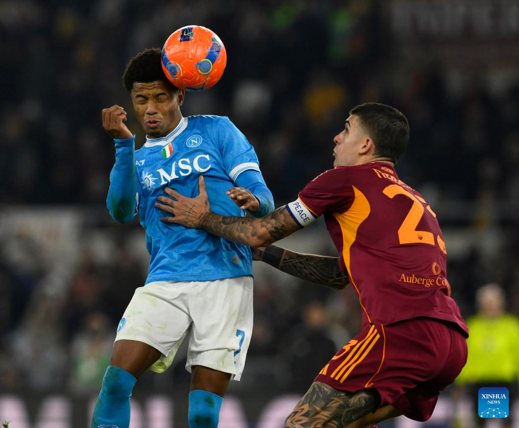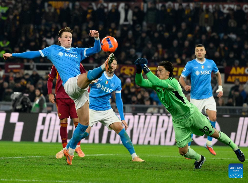 Roma's goalkeeper Mile Svilar (front R) makes a save during a Serie A soccer match between Roma and Napoli in Rome, Italy, Nov. 30, 2025. (Photo by Alberto Lingria/Xinhua)