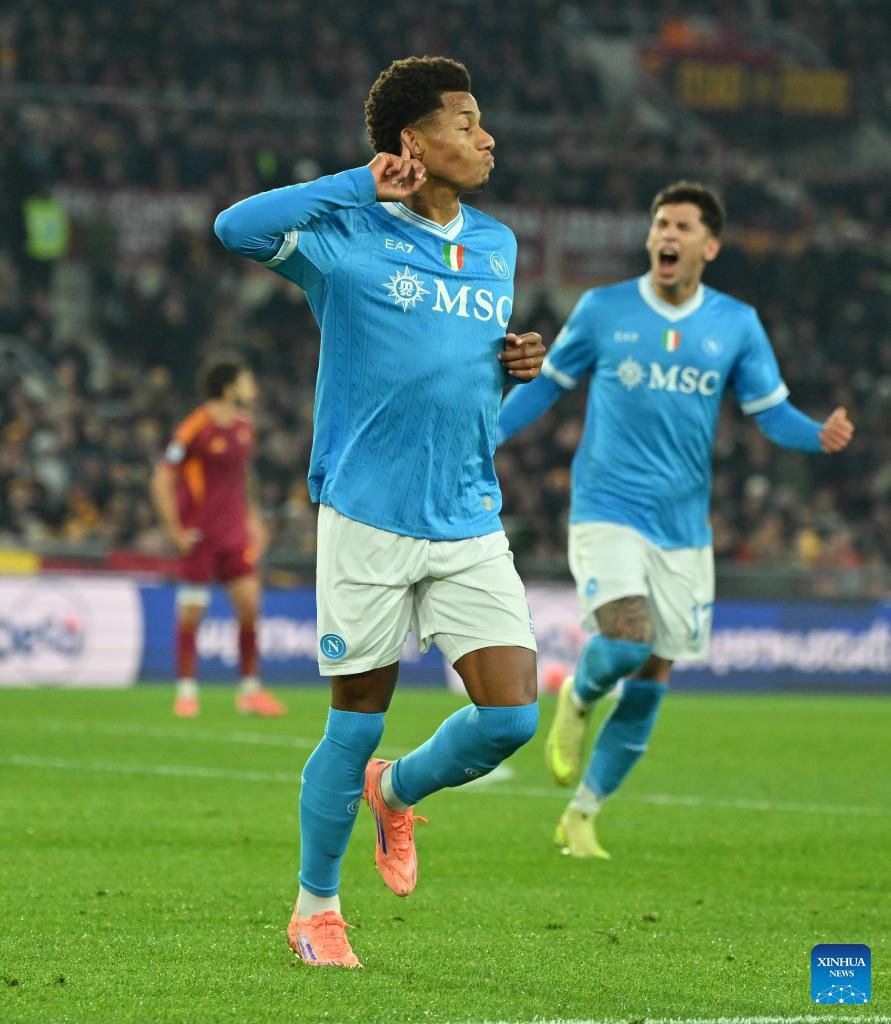 Napoli's David Neres celebrates his goal during a Serie A soccer match between Roma and Napoli in Rome, Italy, Nov. 30, 2025. (Photo by Alberto Lingria/Xinhua)