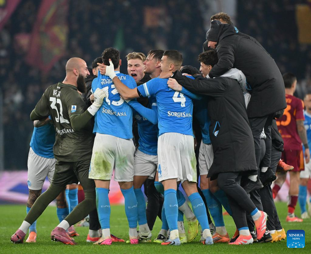 Napoli's players celebrate winning during a Serie A soccer match between Roma and Napoli in Rome, Italy, Nov. 30, 2025. (Photo by Alberto Lingria/Xinhua)