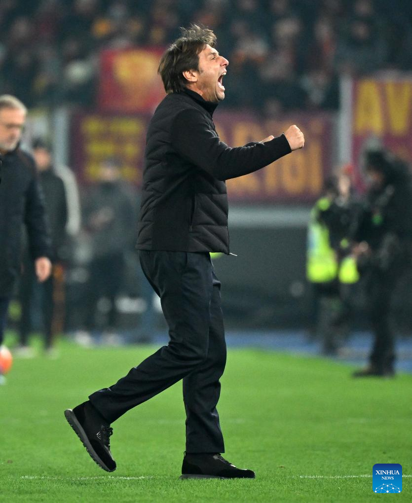Napoli's head coach Antonio Conte celebrates winning during a Serie A soccer match between Roma and Napoli in Rome, Italy, Nov. 30, 2025. (Photo by Alberto Lingria/Xinhua)