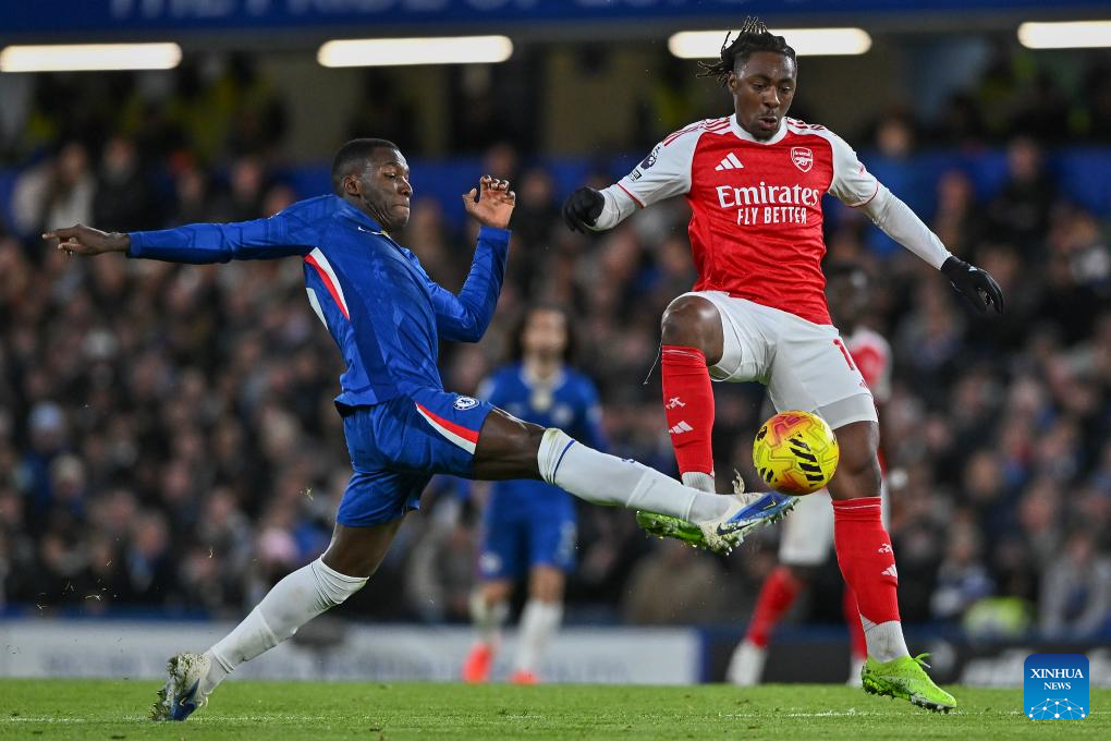 Chelsea's Trevoh Chalobah (L) vies with Arsenal's Mikel Merino during the English Premier League match between Arsenal FC and Chelsea FC in London, Britain, on Nov. 30, 2025. (Xinhua)
