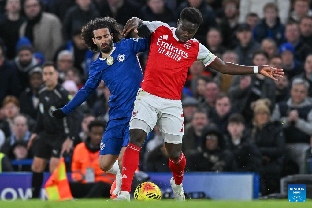 Marc Cucurella (R) of Chelsea vies with Bukayo Saka of Arsenal during the English Premier League match between Arsenal FC and Chelsea FC in London, Britain, on Nov. 30, 2025. (Xinhua)