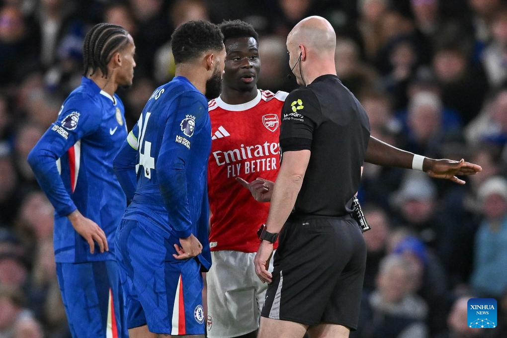 Bukayo Saka (2nd R) of Arsenal speaks to the referee during the English Premier League match between Arsenal FC and Chelsea FC in London, Britain, on Nov. 30, 2025. (Xinhua)