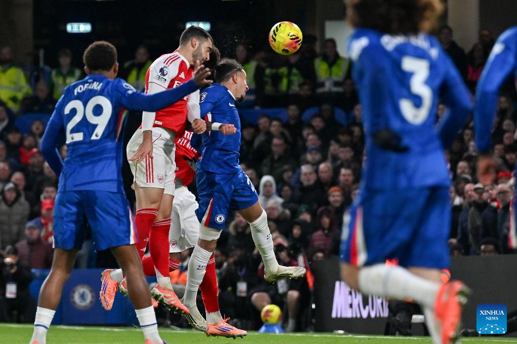 LONDON, Nov. 30 (Xinhua) -- Premier League leader Arsenal was held to a 1-1 draw by 10-man Chelsea at Stamford Bridge on Sunday.