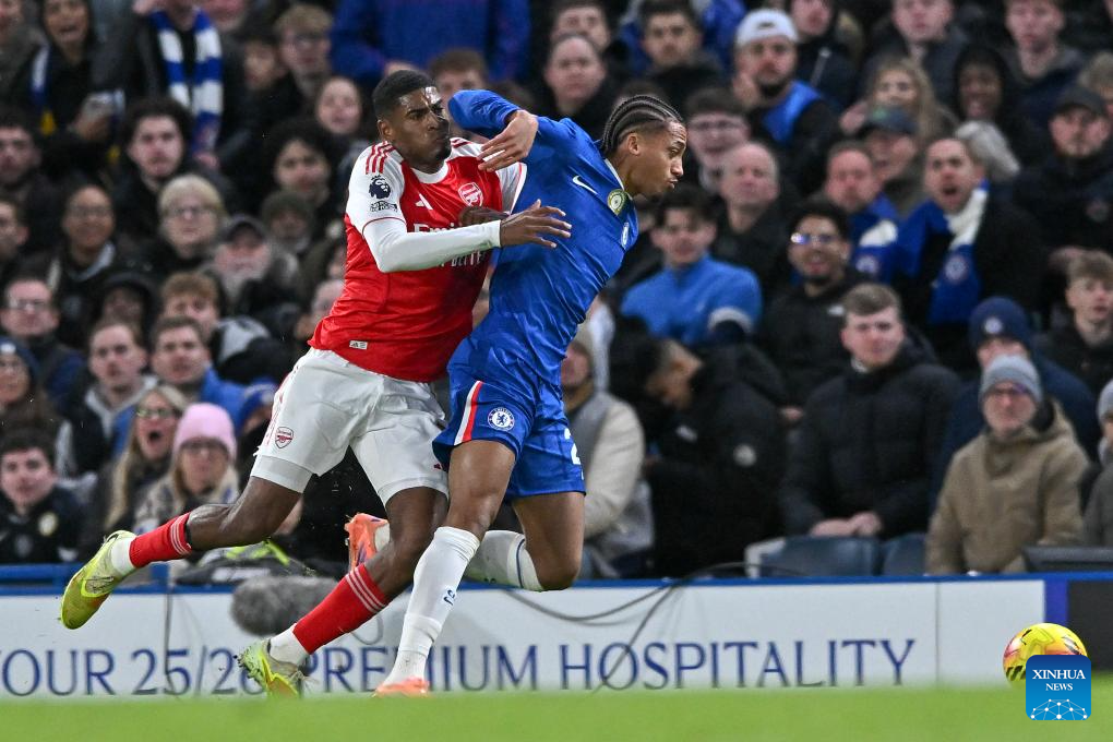 Arsenal's Cristhian Mosquera (L) vies with Chelsea's Joao Pedro during the English Premier League match between Arsenal FC and Chelsea FC in London, Britain, on Nov. 30, 2025. (Xinhua)