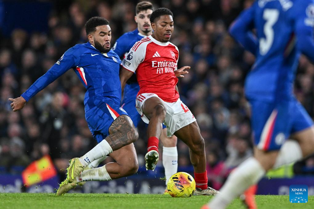 Myles Lewis-Skelly (C) of Arsenal vies with Reece James of Chelsea during the English Premier League match between Arsenal FC and Chelsea FC in London, Britain, on Nov. 30, 2025. (Xinhua)