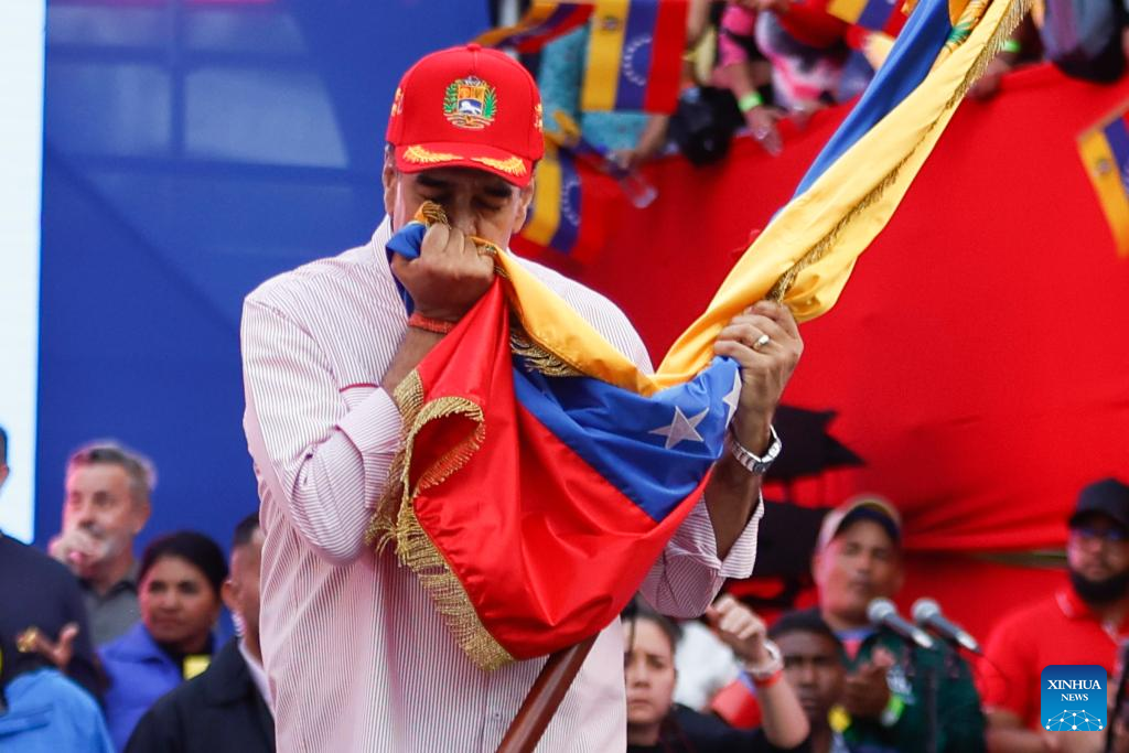 Venezuelan President Nicolas Maduro kisses the Venezuelan national flag during a rally in Caracas, capital of Venezuela, Dec. 1, 2025. (Str/Xinhua)