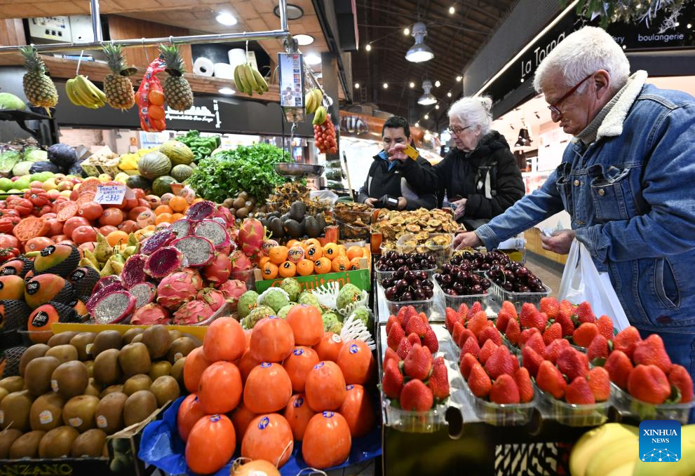 People buy vegetables at a market in Barcelona, Spain, Dec. 2, 2025. (Xinhua/Cheng Min)